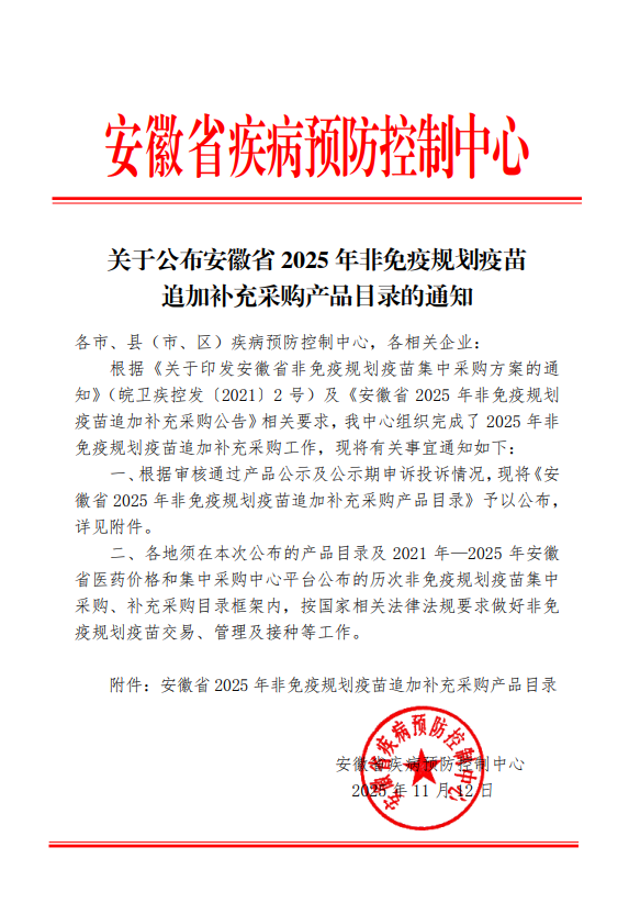 【安徽】关于公布安徽省2025年非免疫规划疫苗追加补充采购产品目录的通知