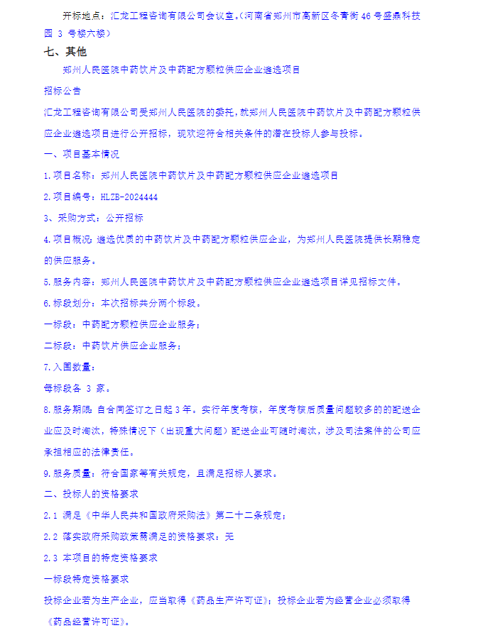 【郑州人民医院】河南省郑州人民医院中药饮片及中药配方颗粒供应企业遴选项目招标公告