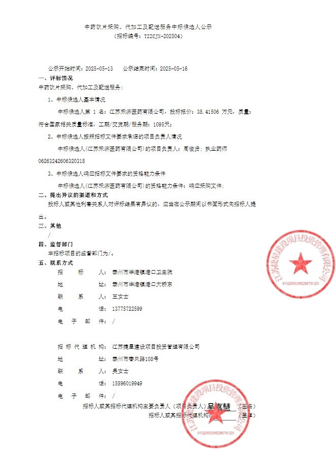【泰州市华港镇港口卫生院】江苏省泰州市华港镇港口卫生院中药饮片采购、代加工及配送服务中标候选人公示