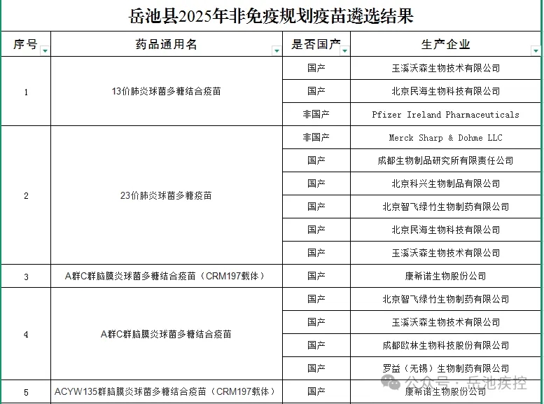 根据《四川省卫生健康委员会关于印发疫苗全程管理风险防控工作方案(2023年版)的通知》(川卫疾控函〔2023〕11号)和《岳池县卫生健康局〈关于印发岳池县非免疫规划疫苗遴选采购方案(2025年版)的通知〉》的文件精神,岳池县疾病预防控制中心组织全县所有接种单位代表及部分岳池县非免疫规划疫苗遴选采购工作领导小组成员按照公平、公正、公开的原则,开展了岳池县2025年非免疫规划疫苗遴选工作,现将遴选结果排在前五位(原代和传代狂犬病疫苗不带VVM标签的狂犬疫苗公示前六位)的疫苗品种及疫苗上市许可持有人予以公示(见附件)。公示期为2025年5月16日至2025年5月23日,请各疫苗上市许可持有人或其委托的代理商在2025年5月26日下午6点前向岳池县疾病预防控制中心提交疫苗遴选申报材料,申报材料逾期送达的,将不予接收。申报材料送至岳池县疾病预防控制中心四楼免疫规划科。