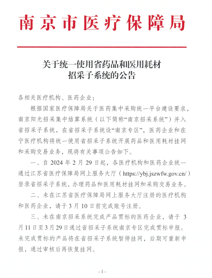 【南京】关于统一使用省药品和医用耗材招采子系统的公告