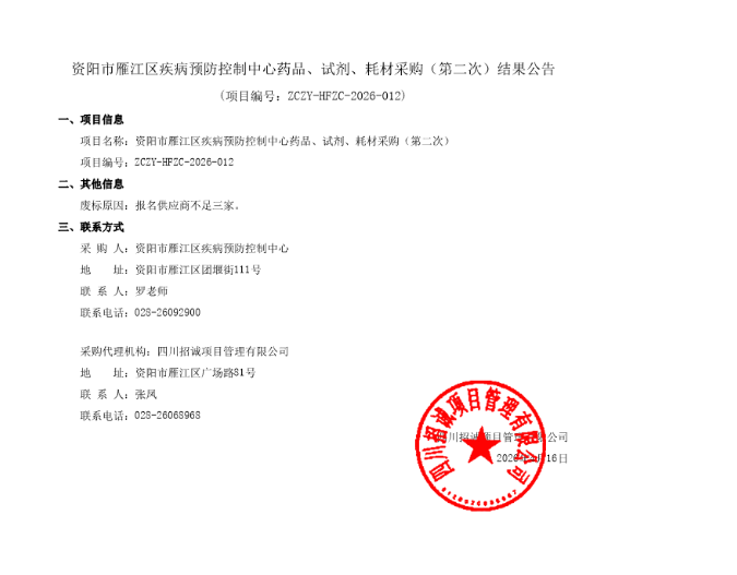 【资阳市雁江区疾病预防控制中心】四川省资阳市雁江区疾病预防控制中心药品、试剂、耗材采购(第二次) - 结果公告