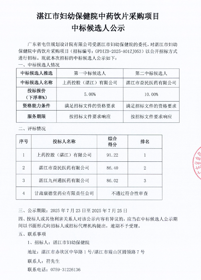 【湛江市妇幼保健院】广东省湛江市妇幼保健院中药饮片采购项目中标候选人公示