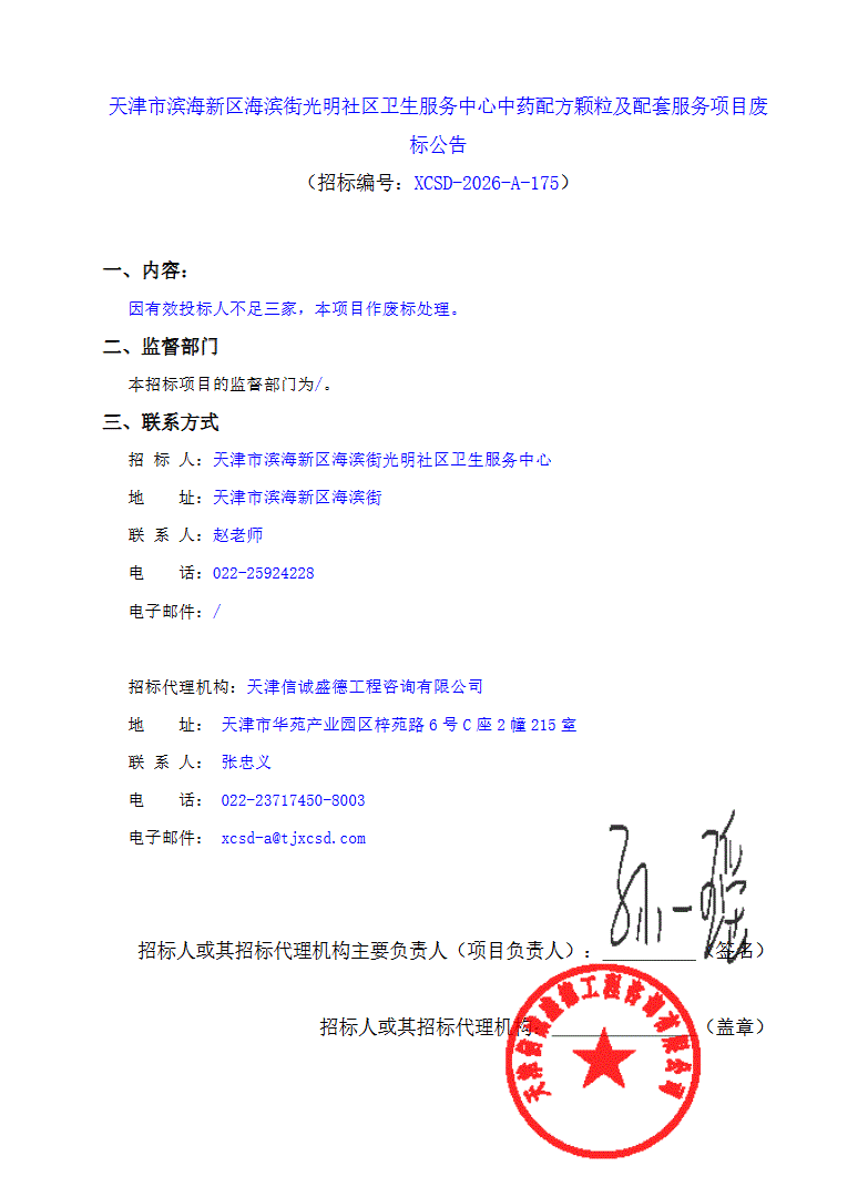 【天津市滨海新区海滨街光明社区卫生服务中心】天津市滨海新区海滨街光明社区卫生服务中心中药配方颗粒及配套服务项目废标公告