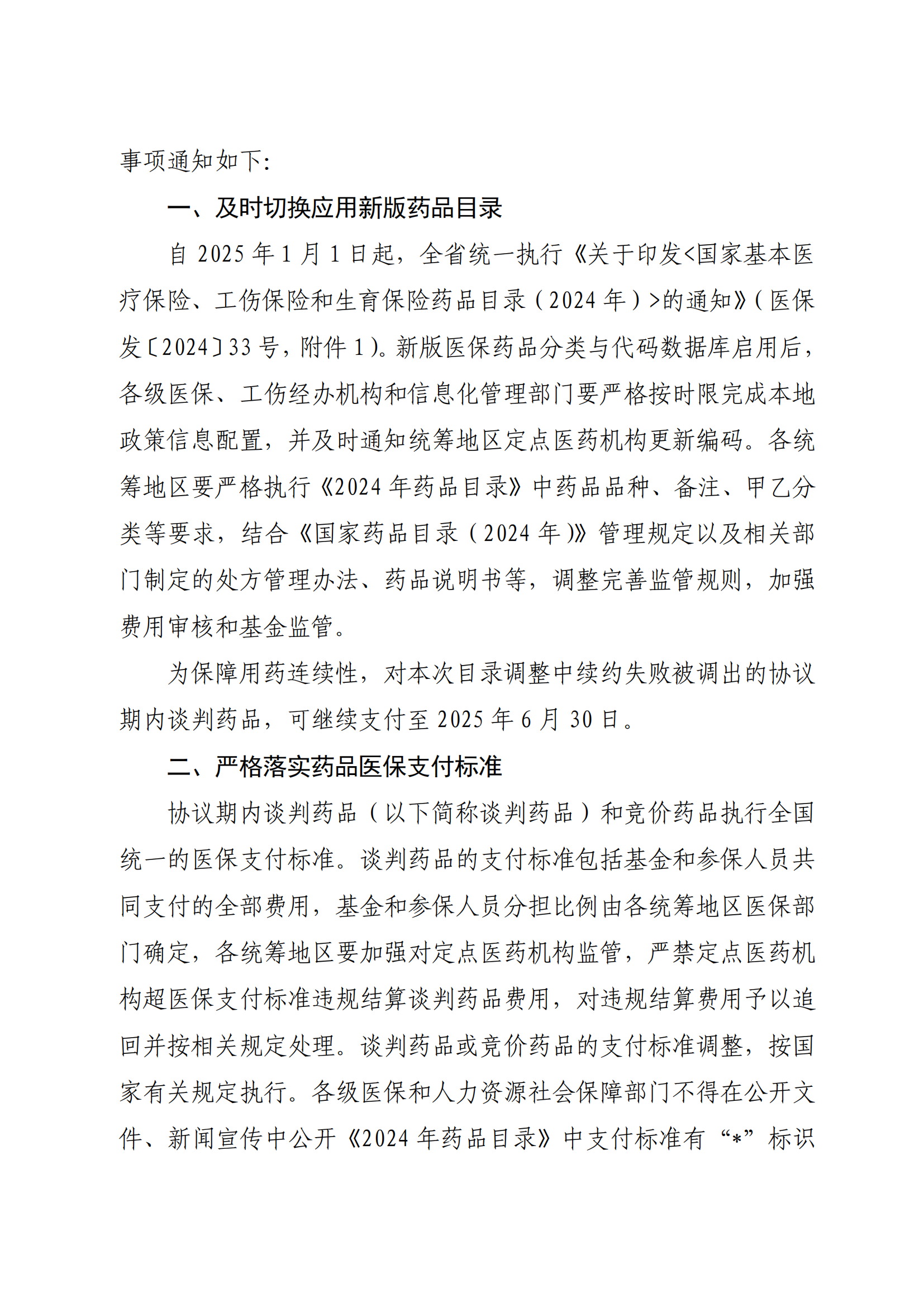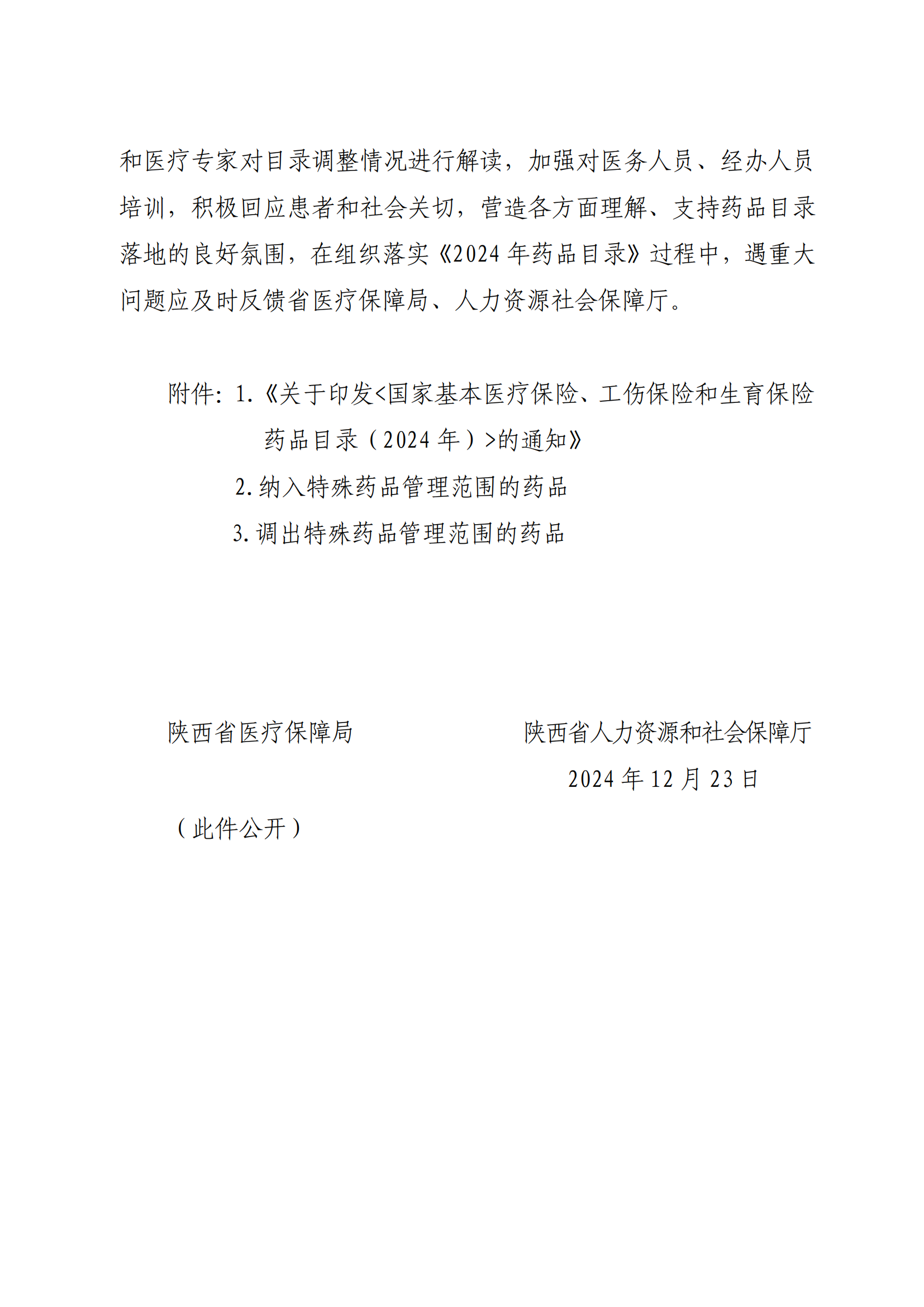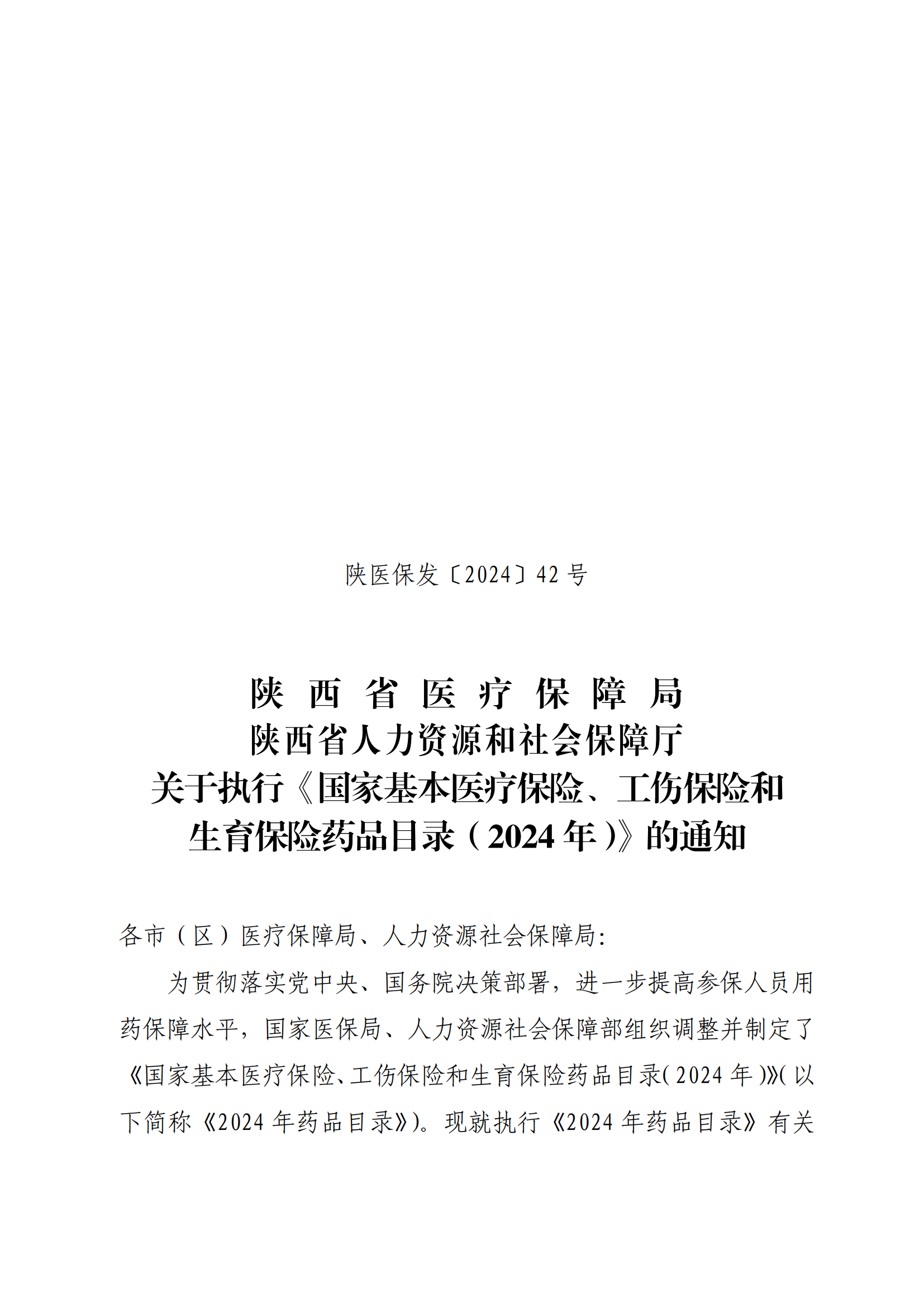【陕西】陕西省医疗保障局陕西省人力资源和社会保障厅关于执行《国家基本医疗保险、工伤保险和生育保险药品目录(2024 年)》的通知