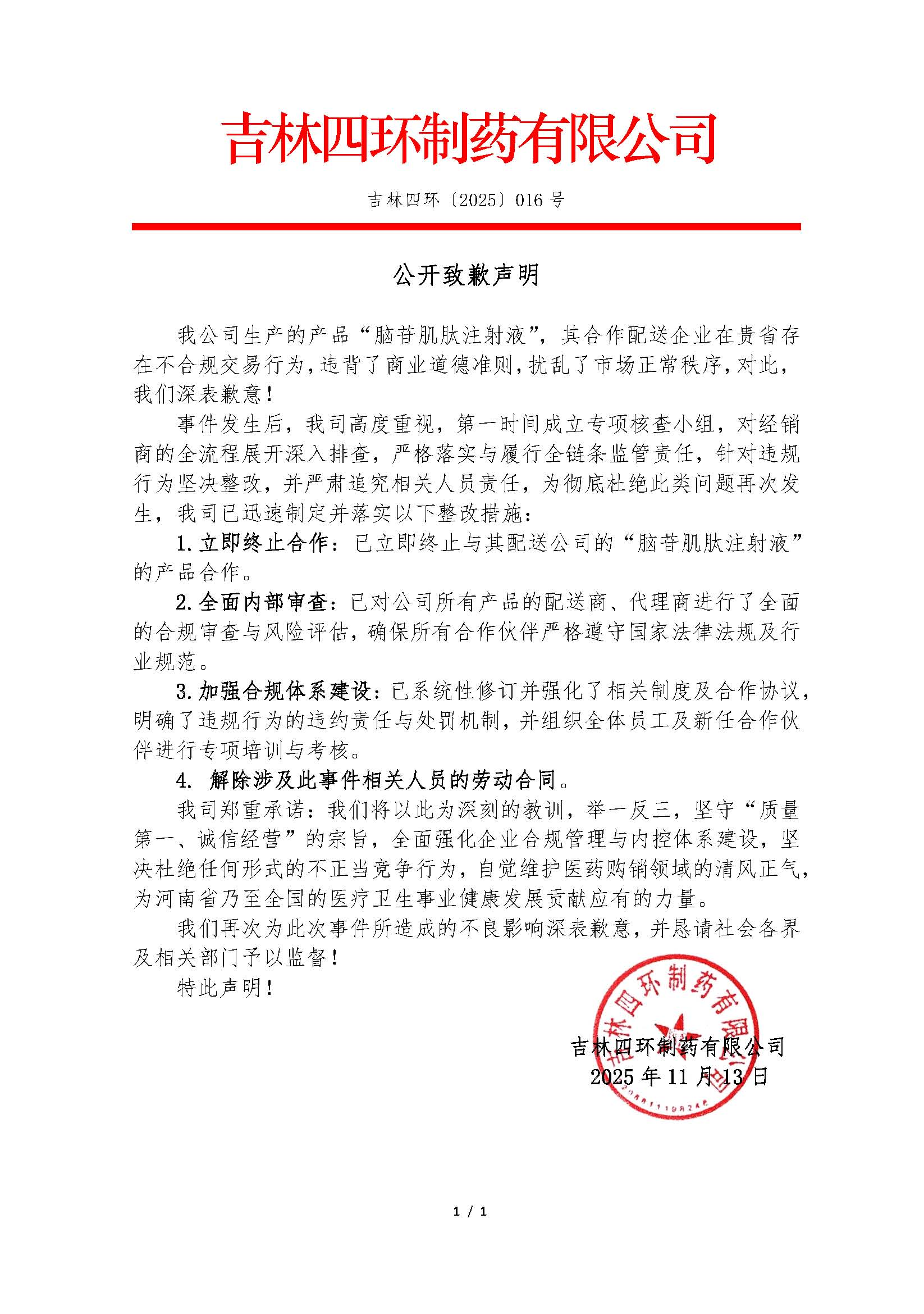 【河南】吉林四环制药有限公司公开致歉信