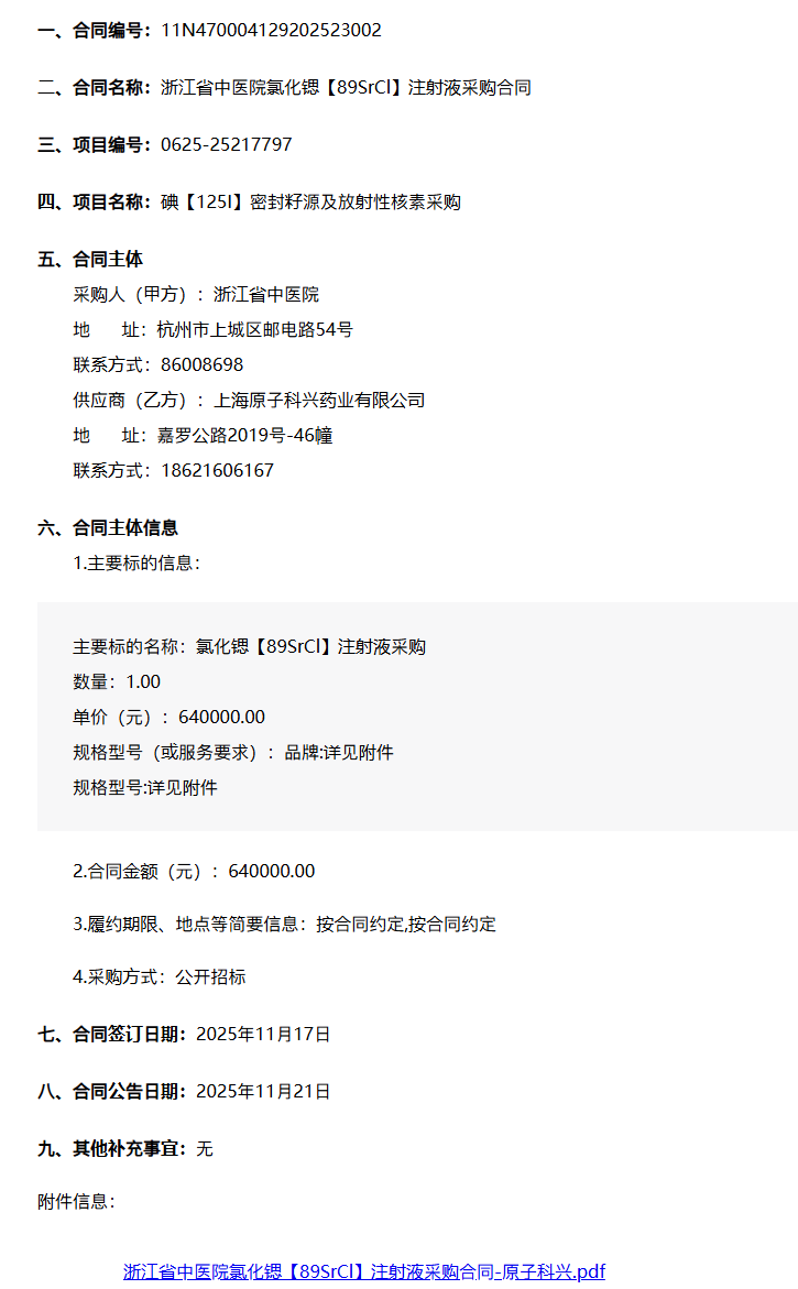 【浙江省中医院】浙江省中医院氯化锶〔89SrCl〕注射液采购合同公告