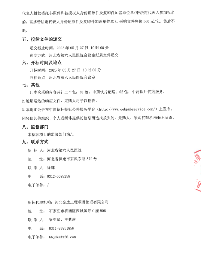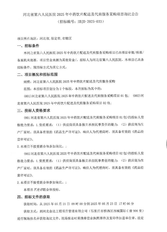 【河北省第六人民医院】河北省第六人民医院2025年中药饮片配送及代煎服务采购项目询比公告