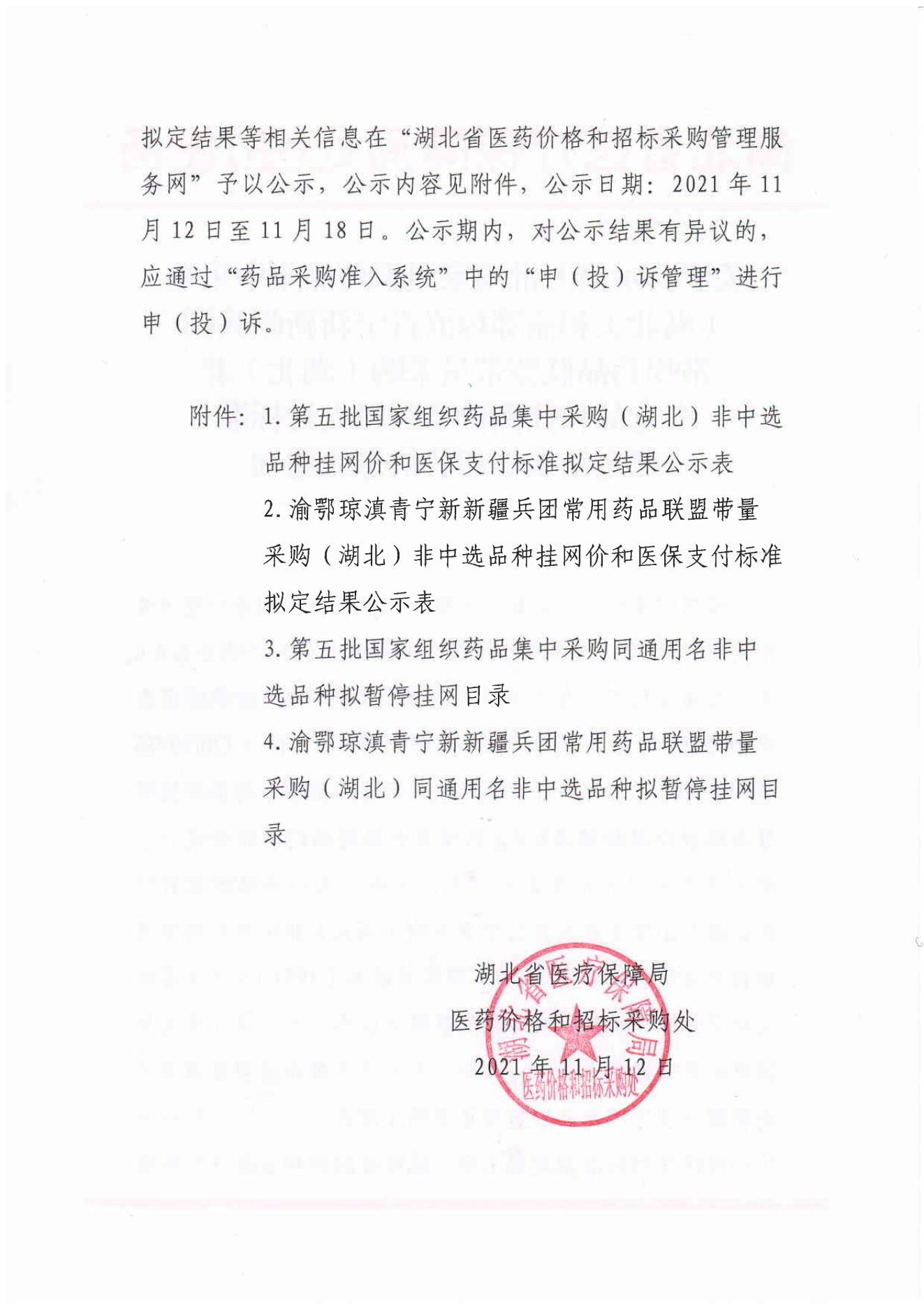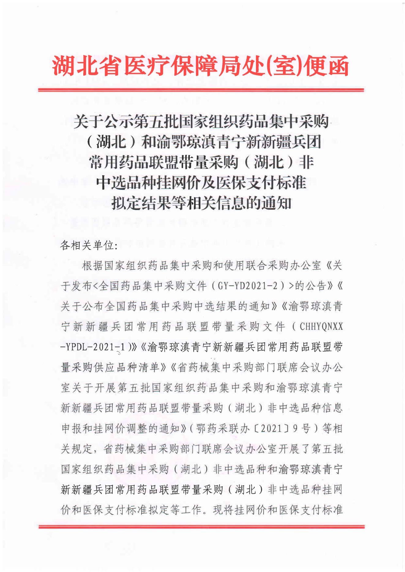 【湖北】湖北省关于公示第五批国家组织药品集中采购(湖北)和渝鄂琼滇青宁新新疆兵团常用药品联盟带量采购(湖北)非中选品种挂网价及医保支付标准拟定结果等相关信息的通知