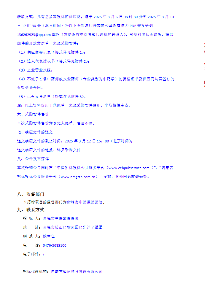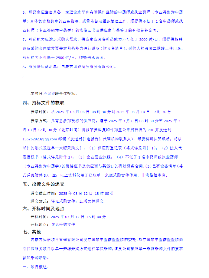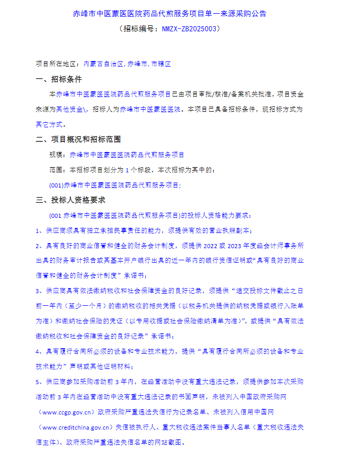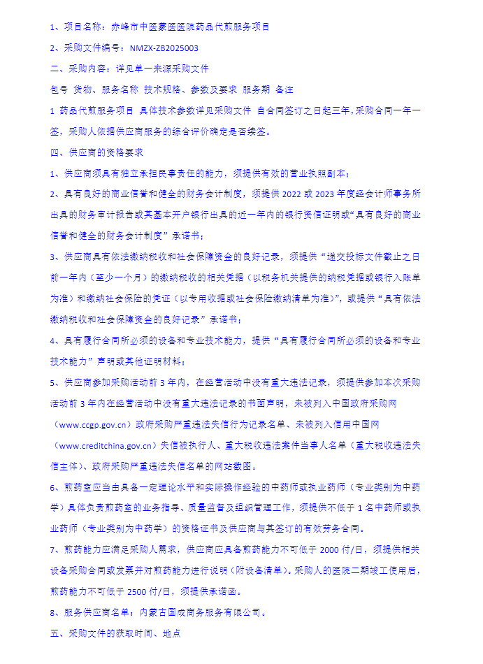 【赤峰市中医蒙医医院】内蒙古自治区赤峰市中医蒙医医院药品代煎服务项目单一来源采购公告