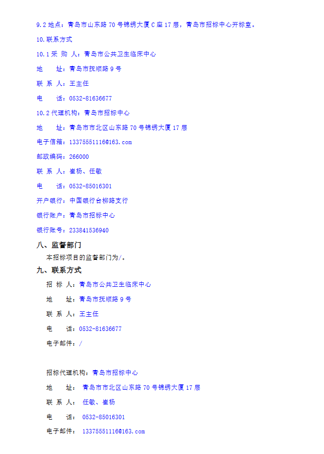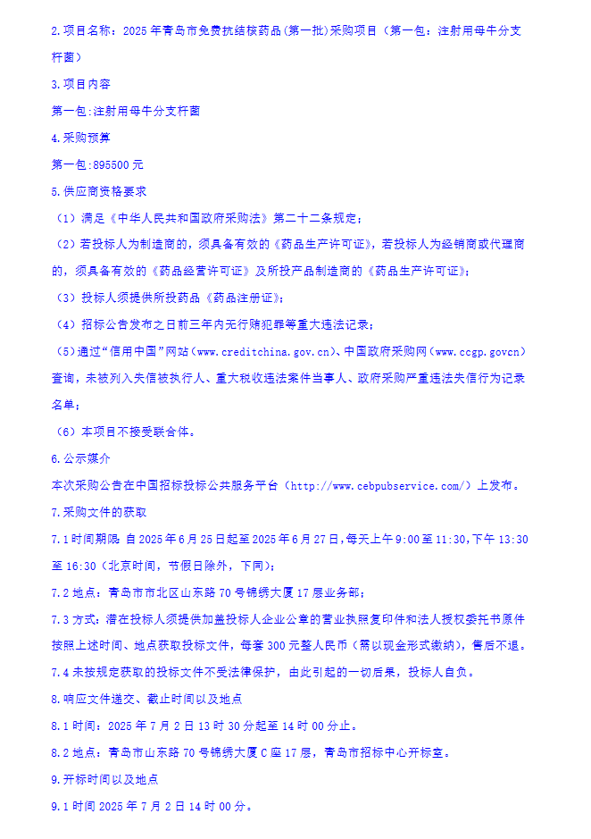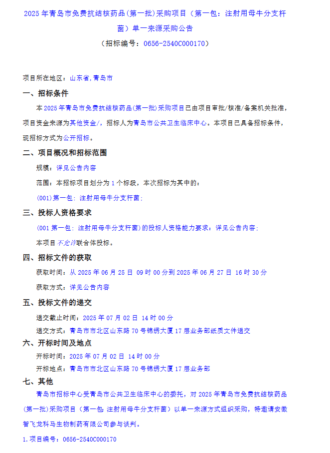 【青岛市公共卫生临床中心】山东省2025年青岛市免费抗结核药品(第一批)采购项目(第一包:注射用母牛分支杆菌)单一来源采购公告