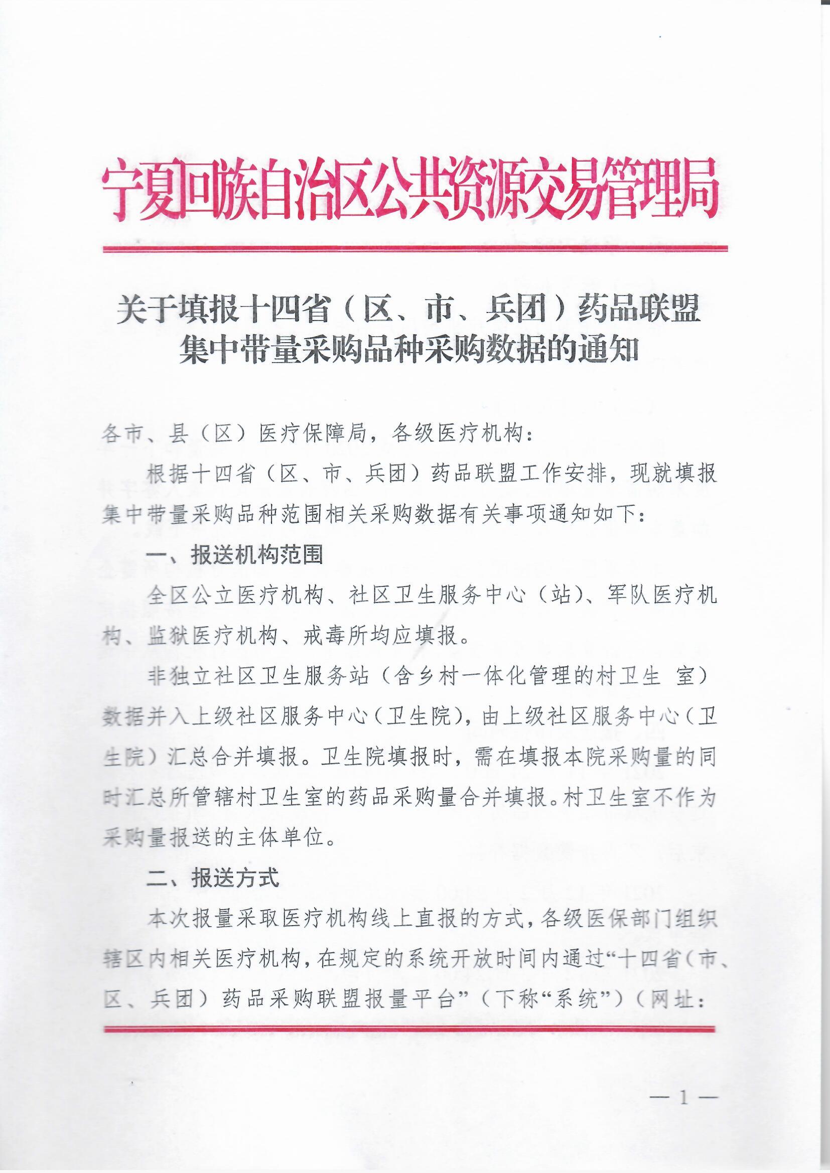【宁夏】宁夏回族自治区关于填报十四省(区、市、兵团)药品联盟集中带量采购品种采购数据的通知