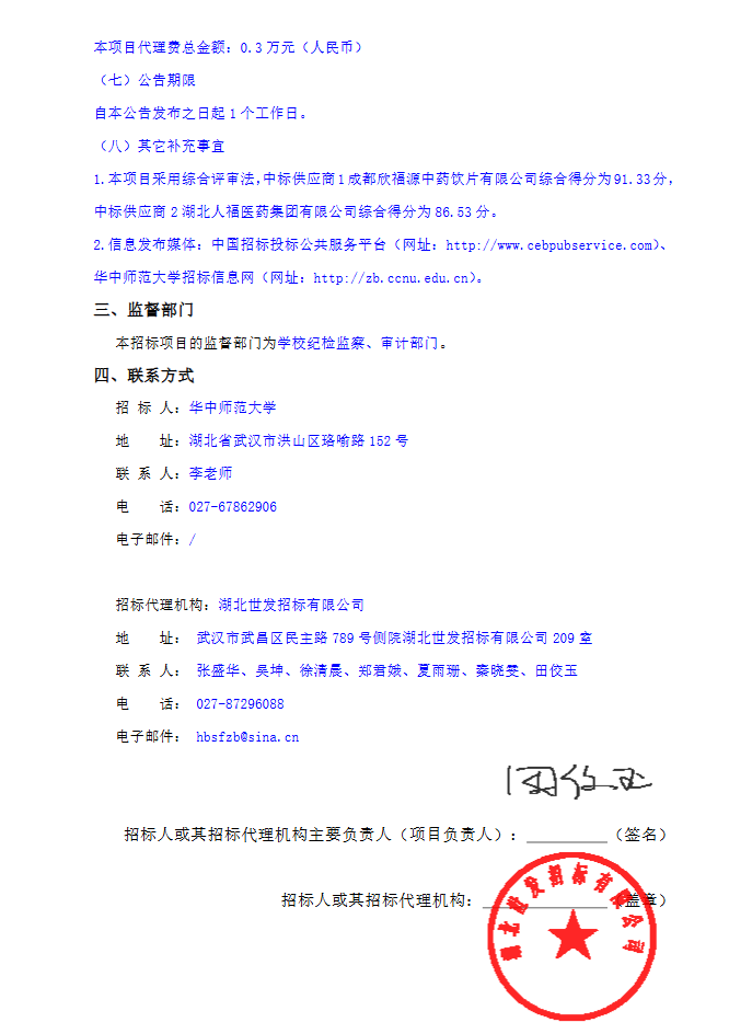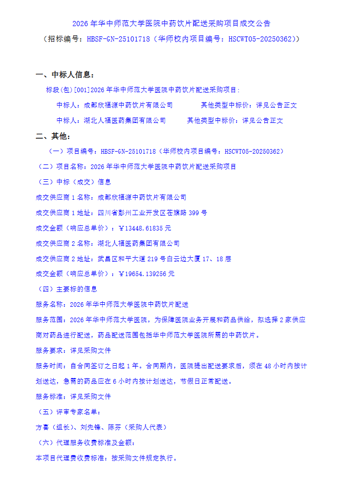 【武汉华中师范大学医院】湖北省2026年华中师范大学医院中药饮片配送采购项目成交公告