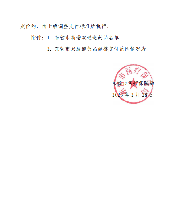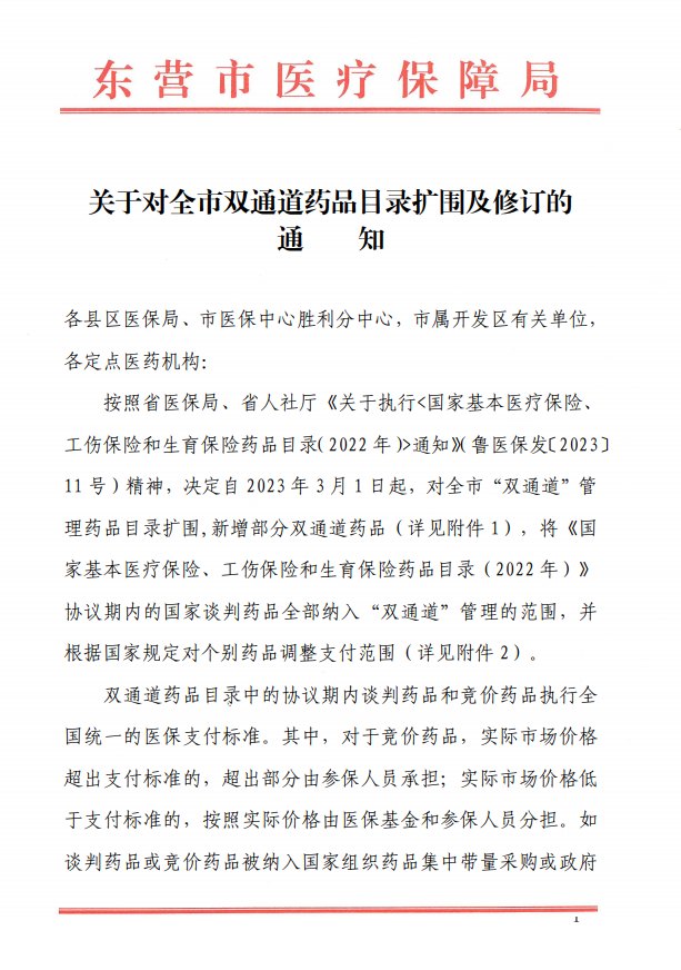 按照省医保局、省人社厅《关于执行<国家基本医疗保险、工伤保险和生育保险药品目录(2022年)>通知》(鲁医保发〔2023〕11号)精神,决定自2023年3月1日起,对全市“双通道”管理药品目录扩围,新增部分双通道药品(详见附件1),将《国家基本医疗保险、工伤保险和生育保险药品目录(2022年)》协议期内的国家谈判药品全部纳入"双通道"管理的范围,并根据国家规定对个别药品调整支付范围(详见附件2)。