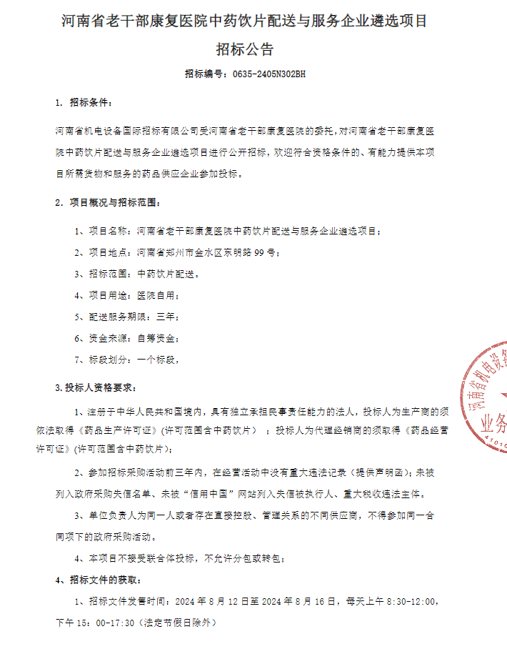 【河南省老干部康复医院】河南省老干部康复医院中药饮片配送与服务企业遴选项目-招标公告