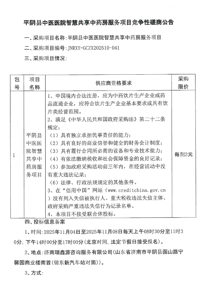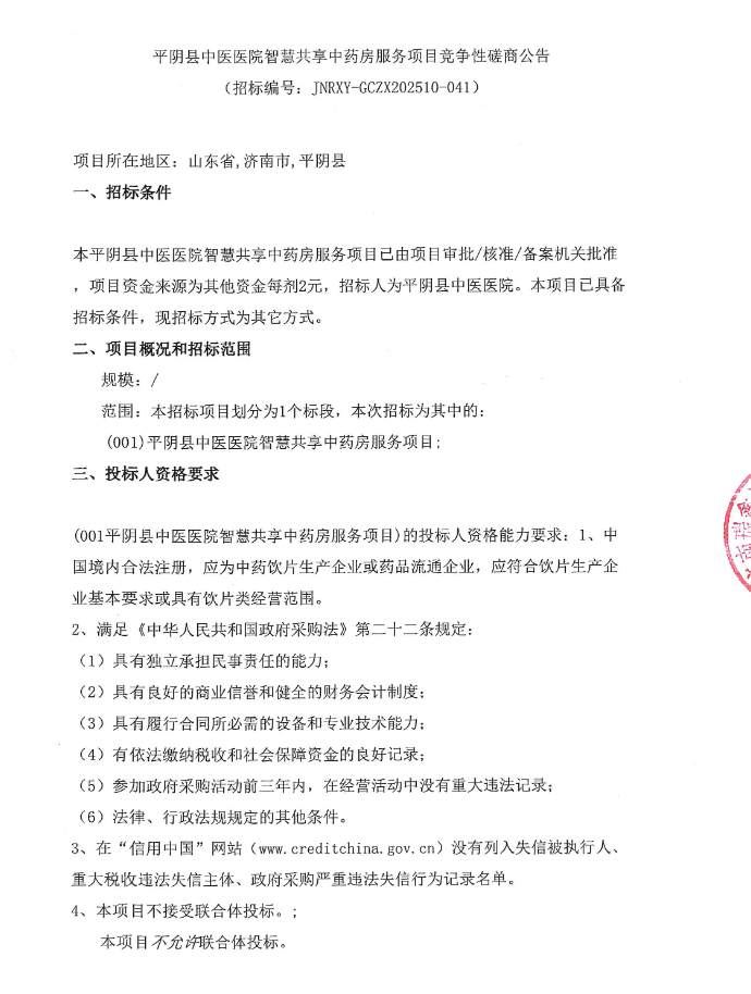 【济南市平阴县中医医院】山东省济南市平阴县中医医院智慧共享中药房服务项目竞争性磋商公告