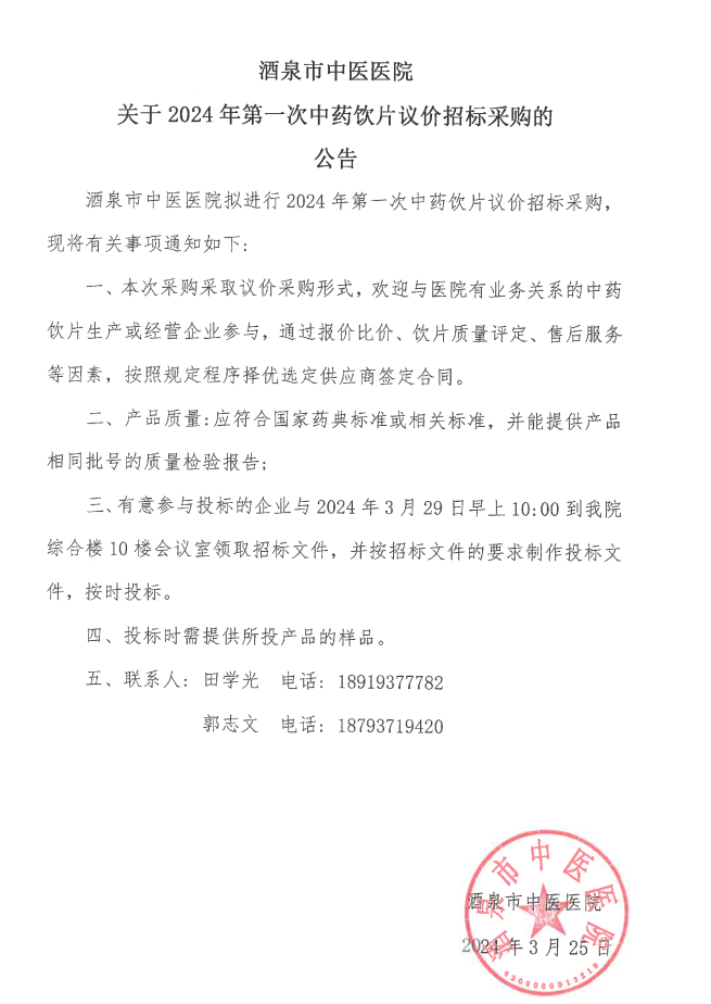 【酒泉市中医医院】甘肃省酒泉市中医医院关于2024年第一次中药饮片议价招标采购的公告