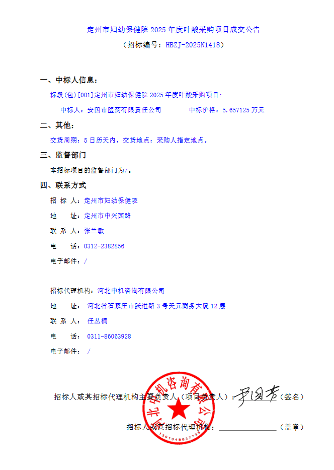 【保定市定州市妇幼保健院】河北省定州市妇幼保健院2025年度叶酸采购项目成交公告