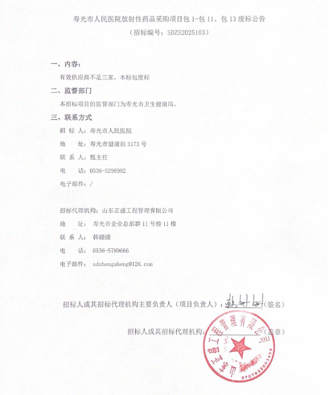 【潍坊市寿光市人民医院】山东省寿光市人民医院放射性药品采购项目包1-包11、包13废标公告