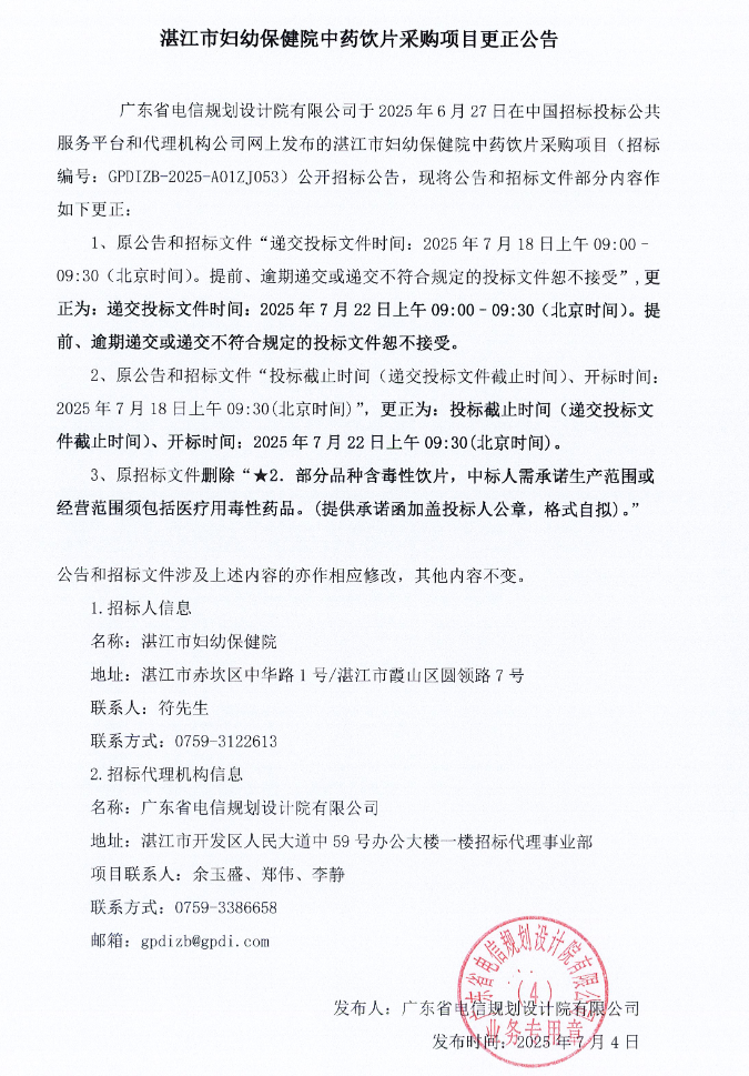 【湛江市妇幼保健院】广东省湛江市妇幼保健院中药饮片采购项目更正公告