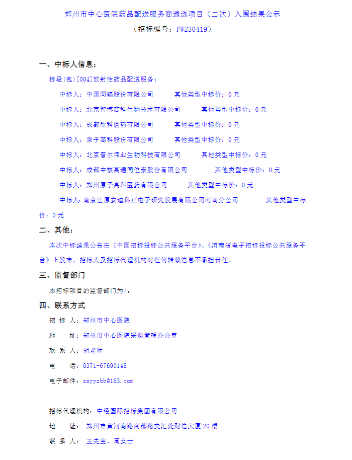 【郑州市中心医院】河南省郑州市中心医院药品配送服务商遴选项目(二次)入围结果公示