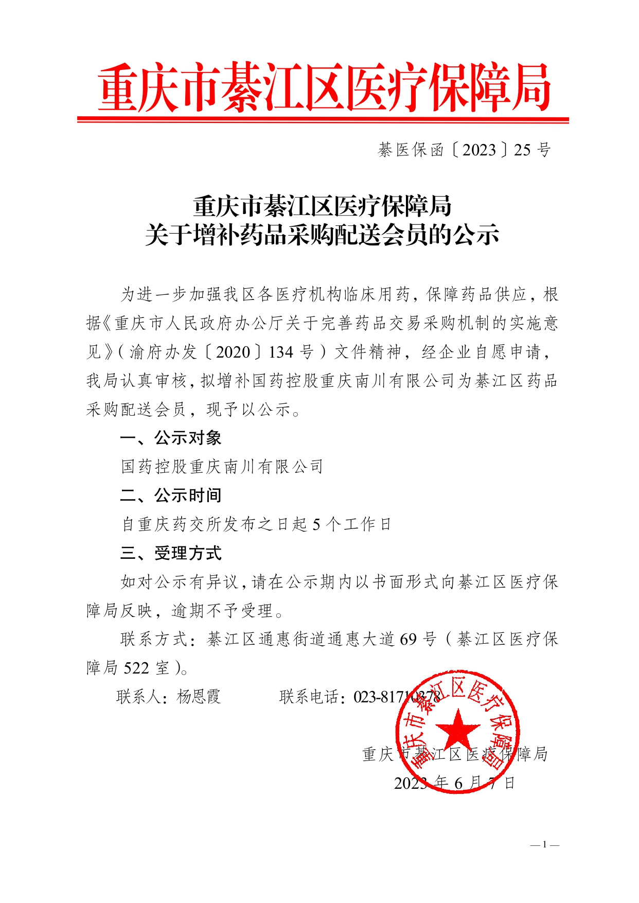 为进一步加强我区各医疗机构临床用药,保障药品供应,根据《重庆市人民政府办公厅关于完善药品交易采购机制的实施意见》(渝府办发〔2020〕134号)文件精神,经企业自愿申请,我局认真审核,拟增补国药控股重庆南川有限公司为綦江区药品采购配送会员,现予以公示。