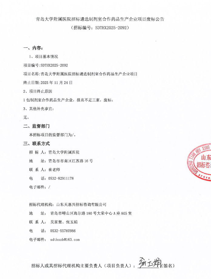 【青岛大学附属医院】山东省青岛大学附属医院招标遴选制剂室合作药品生产企业项目废标公告