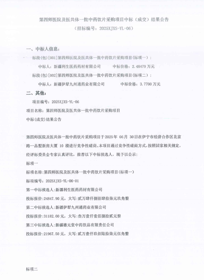 【新疆生产建设兵团第四师医院】新疆生产建设兵团第四师医院及医共体一批中药饮片采购项目中标(成交)结果公告