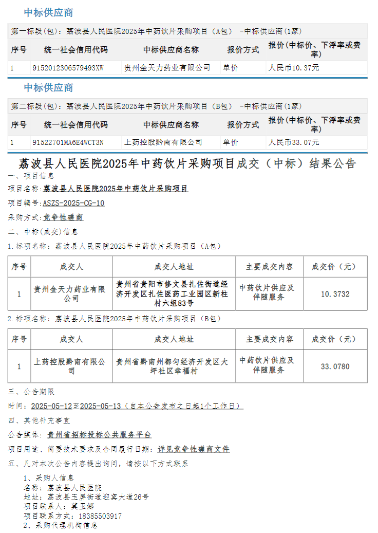 【黔西南布依苗族自治州荔波县人民医院】贵州省黔西南布依苗族自治州荔波县人民医院2025年中药饮片采购项目成交(中标)结果公告