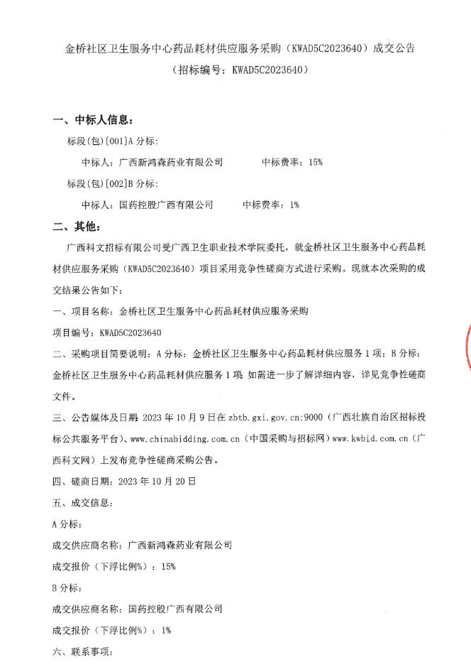 【成都市双流区金桥社区卫生服务中心】四川省成都市双流区金桥社区卫生服务中心药品耗材供应服务采购(KWAD5C2023640)成交公告