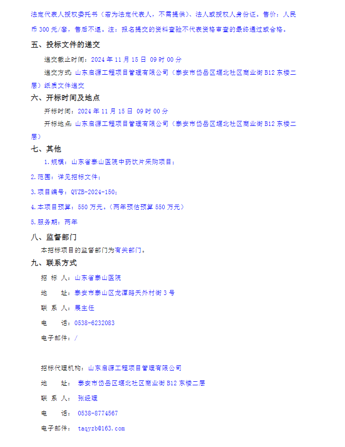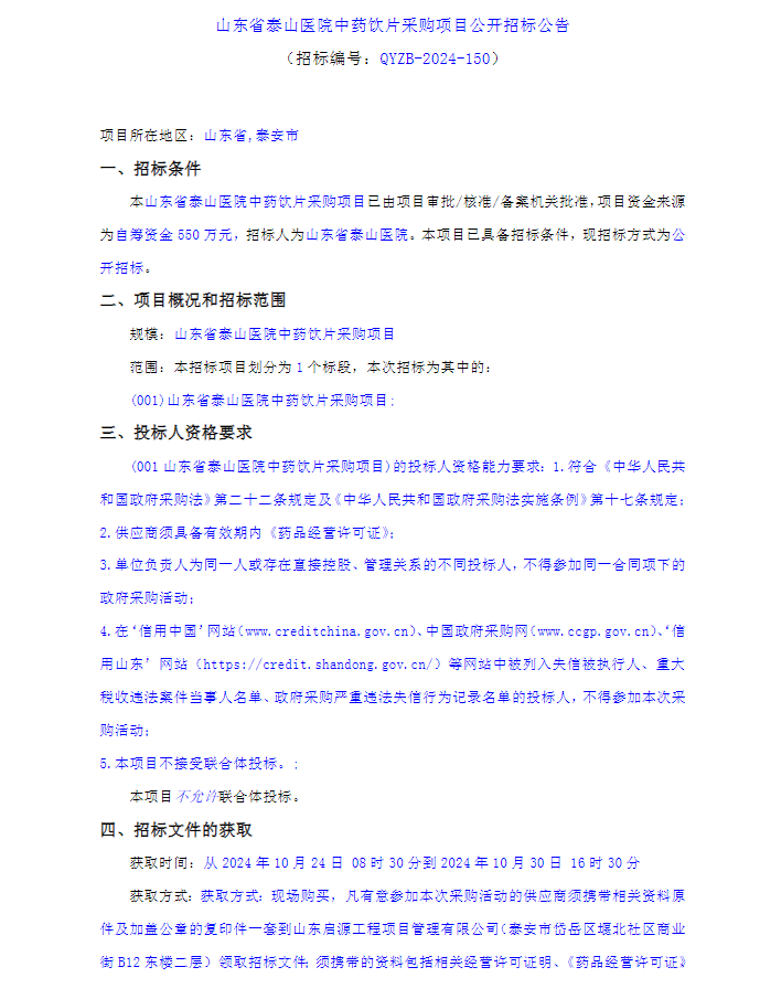 【山东省泰山医院】山东省泰山医院中药饮片采购项目公开招标公告