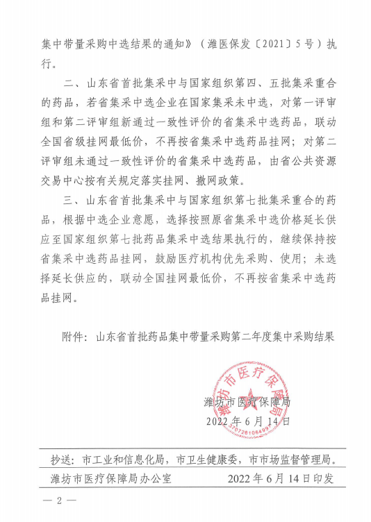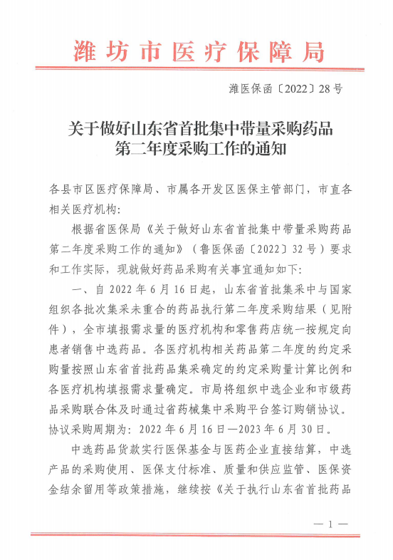 【山东】(潍医保函〔2022〕28号)关于做好山东省首批集中带量采购药品第二年度采购工作的通知