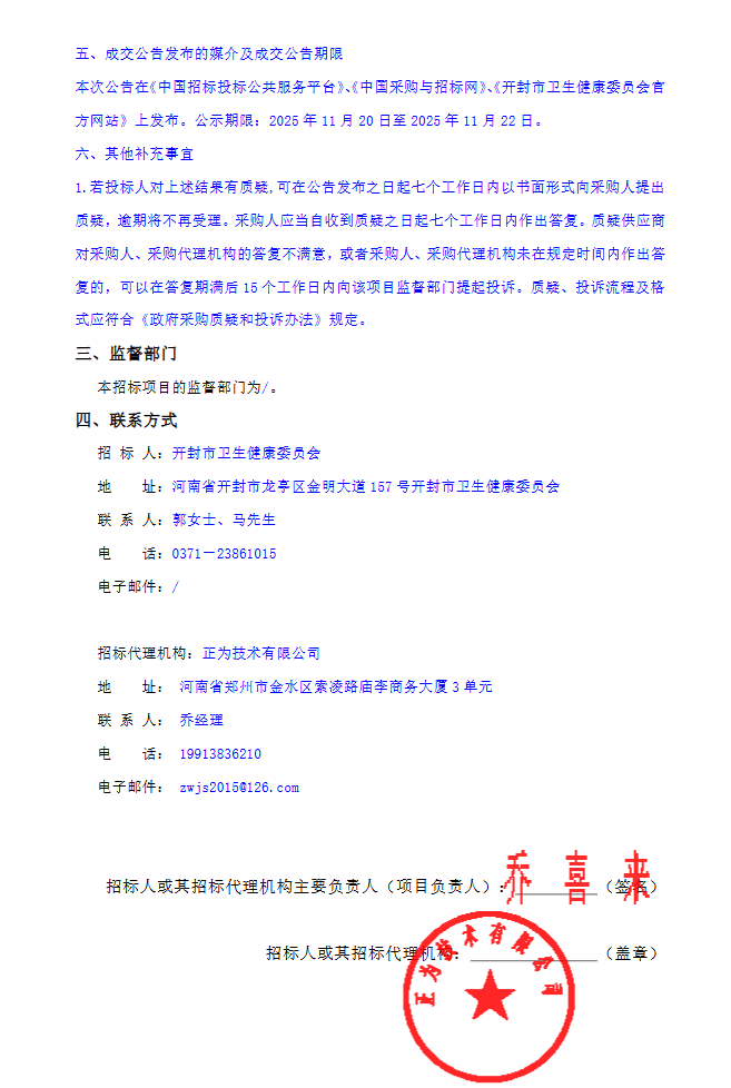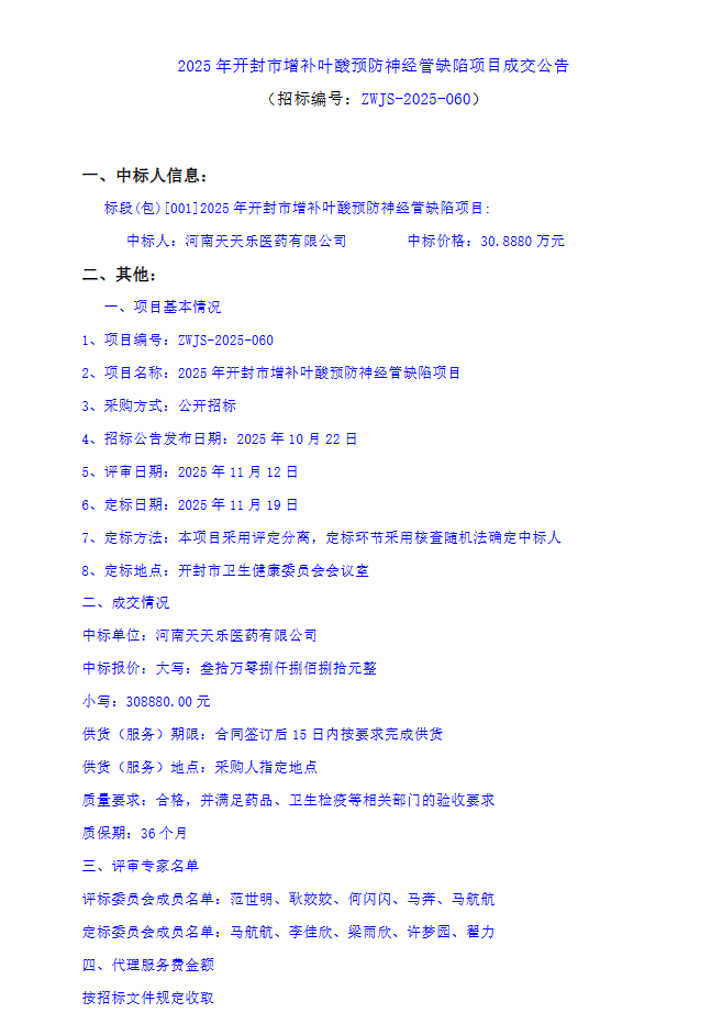 【开封市卫生健康委员】河南省2025年开封市增补叶酸预防神经管缺陷项目成交公告