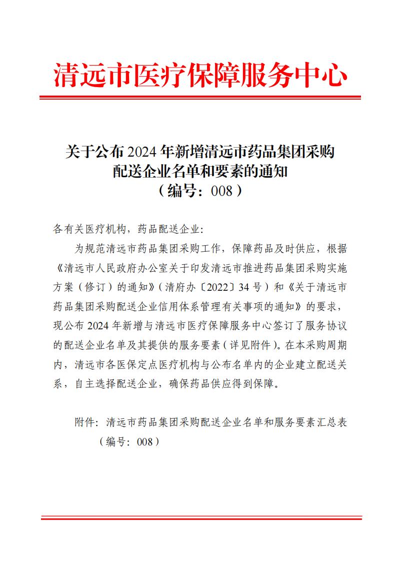 【清远】关于公布2024年新增清远市药品集团采购配送企业名单和要素的通知(编号:008)