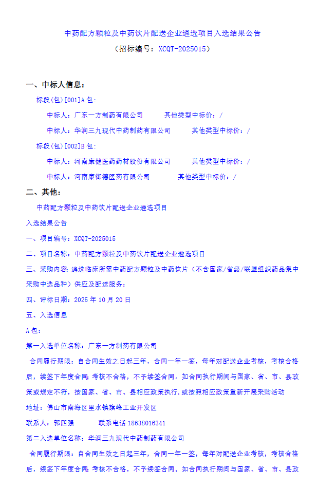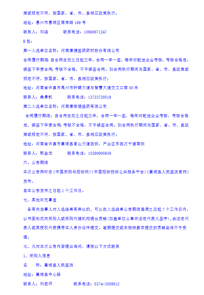 【许昌市襄城县人民医院】河南省许昌市襄城县人民医院中药配方颗粒及中药饮片配送企业遴选项目入选结果公告