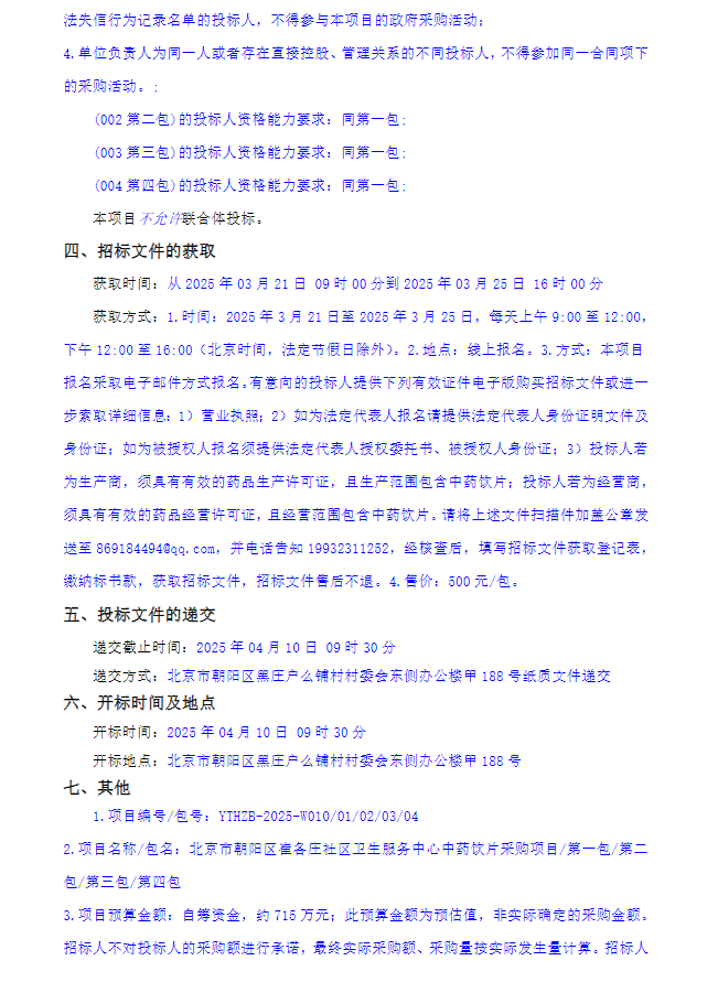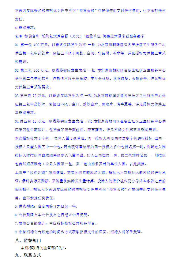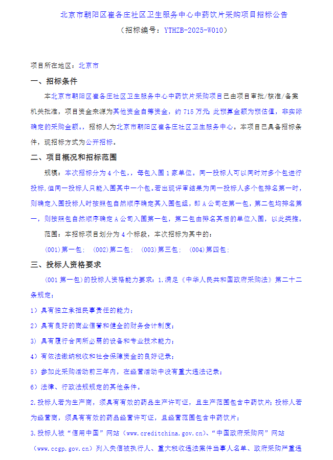 【北京市朝阳区崔各庄社区卫生服务中心】北京市朝阳区崔各庄社区卫生服务中心中药饮片采购项目招标公告