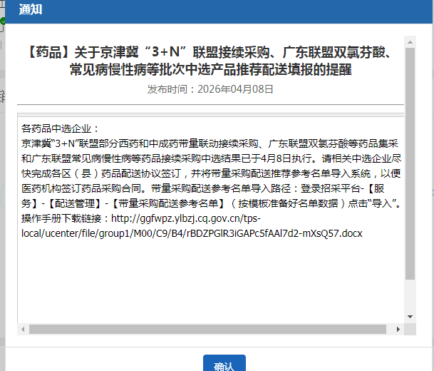【重庆】关于京津冀“3+N”联盟接续采购、广东联盟双氯芬酸、常见病慢性病等批次中选产品推荐配送填报的提醒