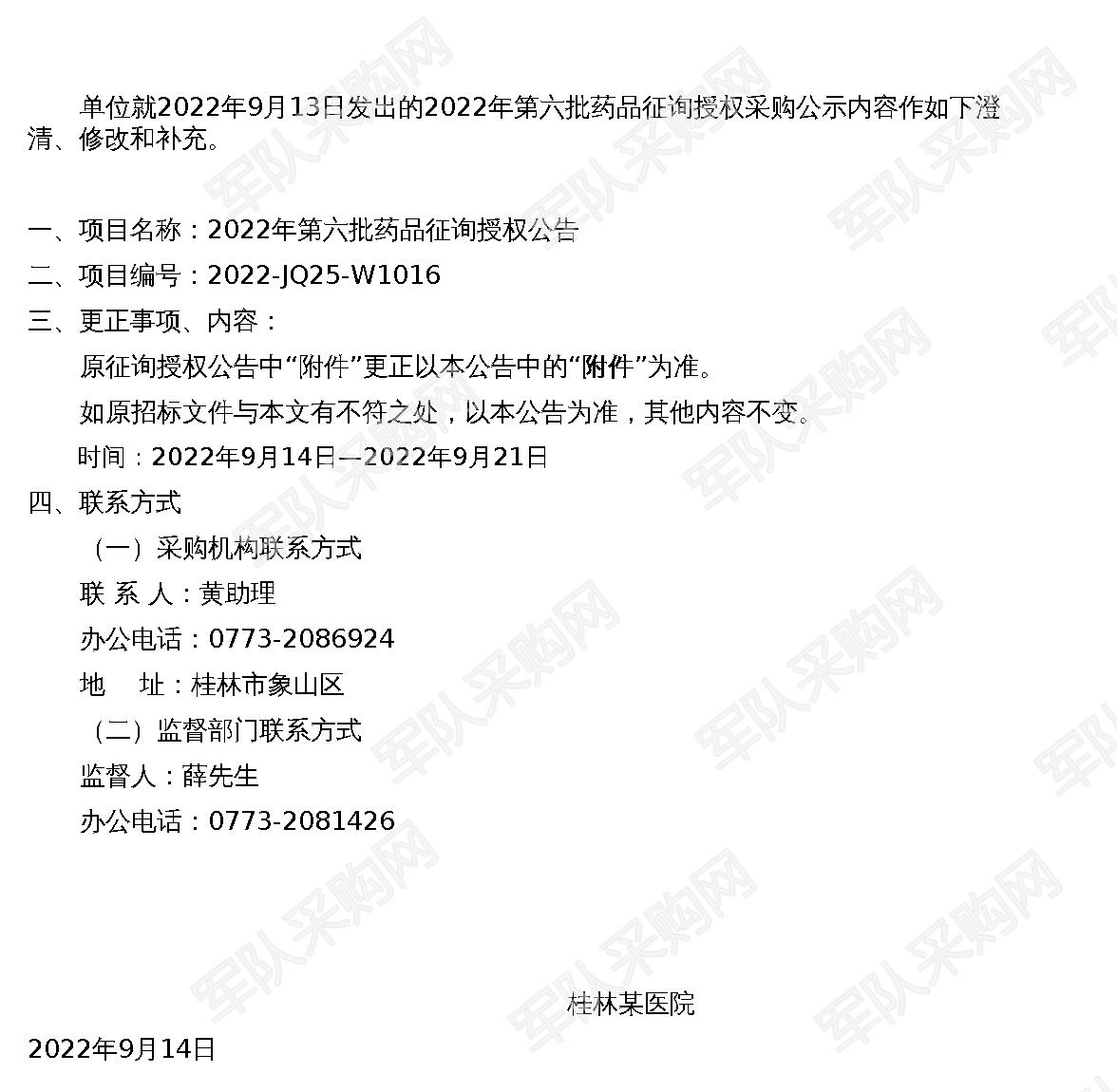 【军队采购网】2022年第六批药品征询授权采购公示更正公告(2022-JQ25-W1016)