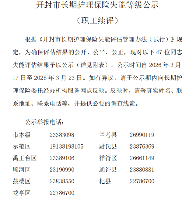 【开封】开封市长期护理保险失能等级公示(职工续评)--第151批