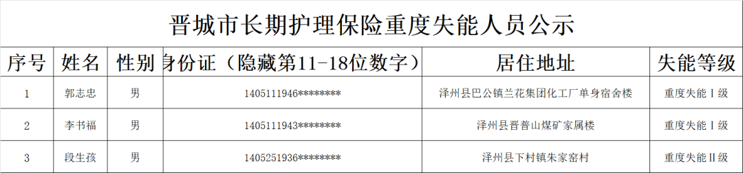 根据《长期护理失能等级评估标准(试行)》《晋城市长期护理保险失能评定管理办法(试行)》规定,经评定,郭志忠、李书福等3位同志符合重度失能标准,现予以公示。