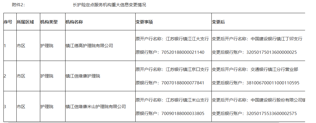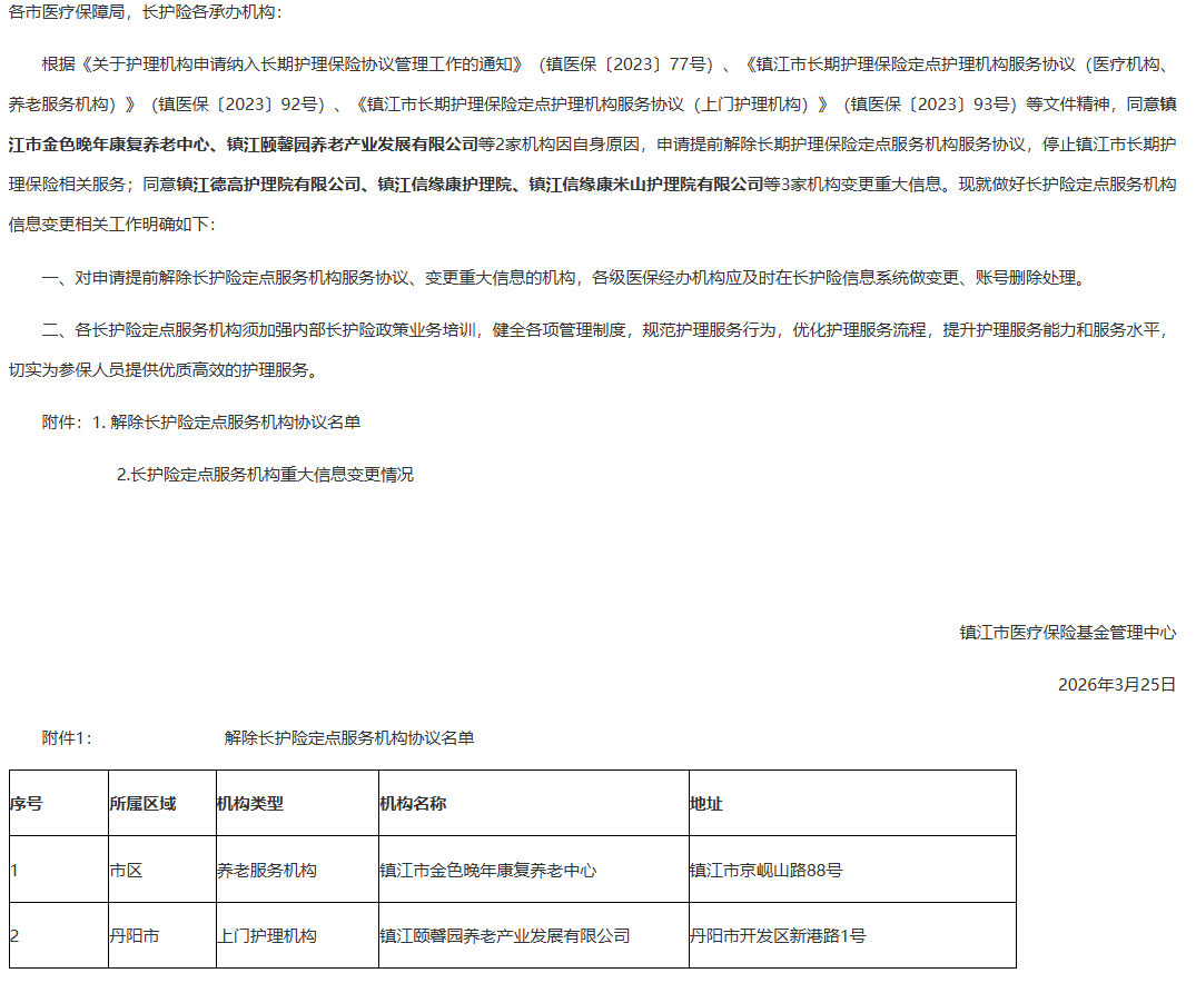 【镇江】关于镇江市长期护理保险定点服务机构解除协议及信息变更的通告
