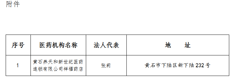 根据《零售药店医疗保障定点管理暂行办法》(国家医疗保障局令第3号)、《湖北省医药机构医疗保障协议管理经办规程》、《湖北省定点零售药店医疗保障服务协议(2025版)》等文件规定,经医药机构自主申请,从2025年12月19日起,解除黄石养天和新世纪医药连锁有限公司祥福药店定点零售药店服务协议(详情见附件)。