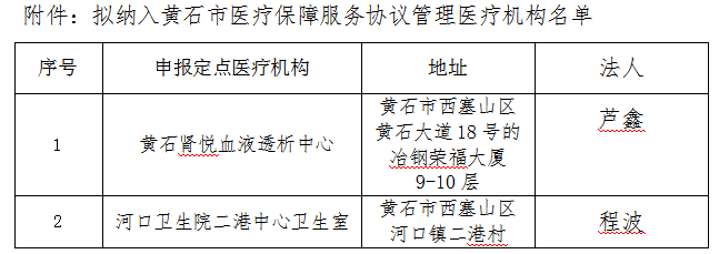 按照《医疗机构医疗保障定点管理暂行办法》(国家医疗保障局令第2号)的规定,经自主申报、现场评估,黄石肾悦血液透析中心、河口卫生院二港中心卫生室符合基本医疗保险定点协议管理及《关于暂停受理新增医保定点医药机构和医保结算类别申请的通告》要求,拟纳入黄石市医疗保障服务协议管理。现予以公示(名单详见附件)。