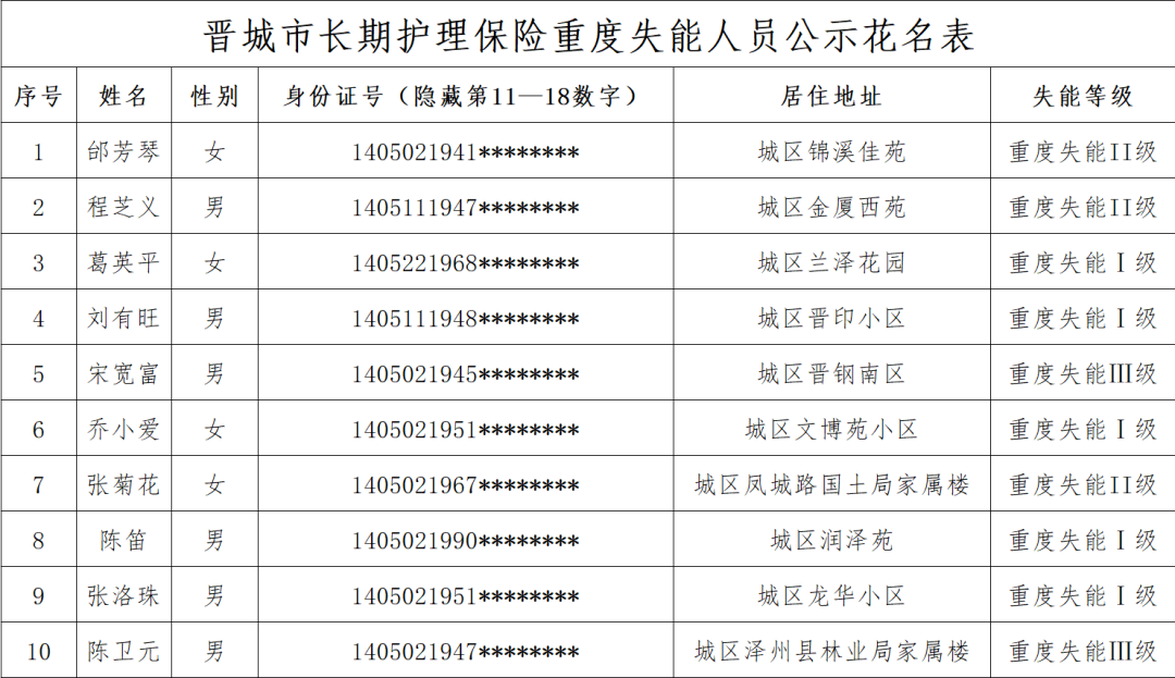 根据《长期护理失能等级评估标准(试行)》《晋城市长期护理保险失能评定管理办法(试行)》规定,经评定,邰芳琴、程芝义等10位同志符合重度失能标准,现予以公示(详见附表)。
