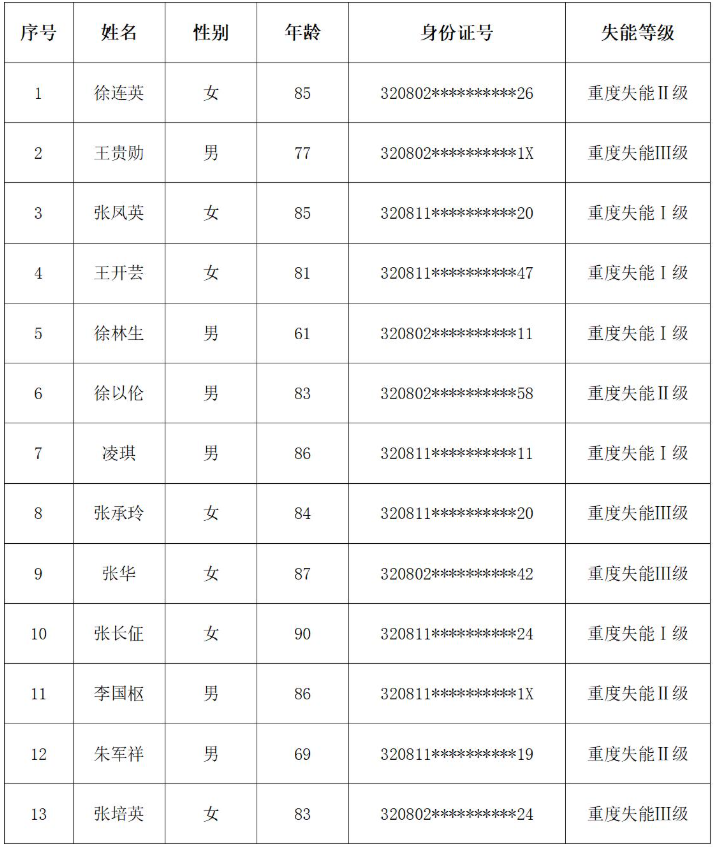 根据《市政府关于印发淮安市长期护理保险实施方案的通知》 (淮政发[2023] 2号) 、《关于印发<淮安市长期护理保险实施细则(试行)>的通知》 (淮政发[2023] 33号)、 《国家医保局办公室 民政部办公厅关于印发<长期护理失能等级评估标准(试行)的通知>(医保办发[2021]37号)》文件精神,经评估机构评估,现将市本级长期护理保险失能等级评估的结论公示如下: