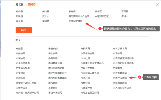 3、根据本人所属选择对应县市后选择医疗保障局,市本级直接市医疗保障局