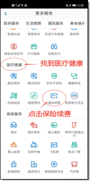 3、选择“医疗健康”下的“保险续费”。