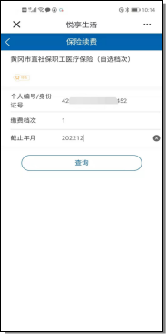 5、选择对应的参保地如:“黄冈市直社保职工医疗保险(自先档次)”,输入自缴或代缴人身份证号码,缴费档次输入 1, 截止年月输入 202312,点击“查询”按钮,按提示缴费。