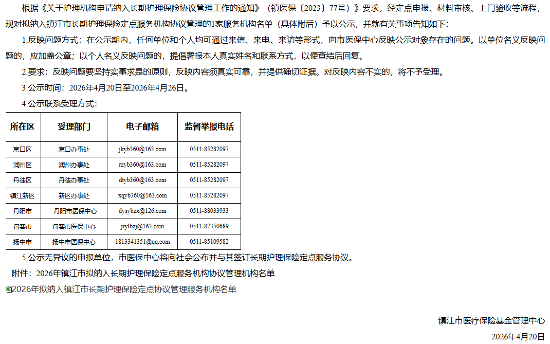 【镇江】2026年镇江市拟纳入长期护理保险定点服务机构协议管理机构名单公示
