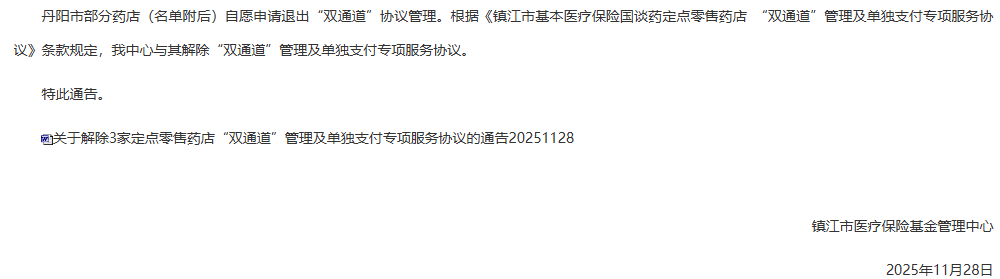 【镇江】关于解除3家定点零售药店“双通道”管理及单独支付专项服务协议的通告